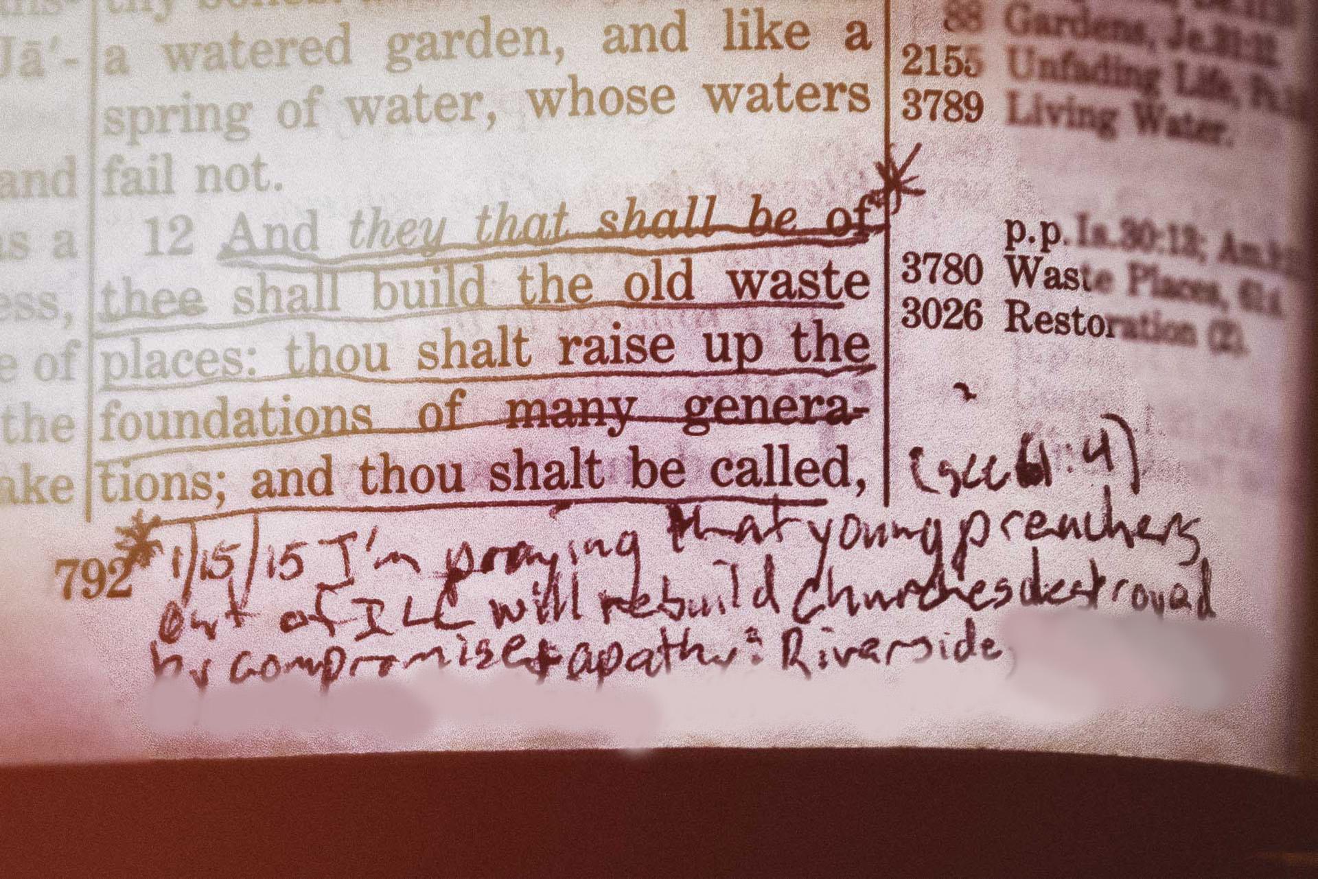 The ILC Riverside campus started with the prayer & desire of Pastor Joel Booker (ILC Rialto). On January 15, 2015, Pastor Booker wrote a note in his Bible next to Isaiah 58:12 asking God to rebuild old, dead churches like the great Apostolic church that was once in Riverside.